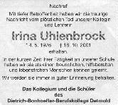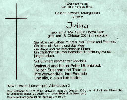 .Wir danken Herrn Gaugg, der unbürokratisch und tatkräftig geholfen hat, die Gedenktafel an Irinas Unfallstelle zu errichten. Mitfühlend hat er uns an diesem Tag begleitet und zur Seite gestanden. Seinen Blumengruß haben wir an Irinas Geburtstag auf ihr Grab gelegt. Danke! Waltraud und Klaus-Peter Uhlenbrock